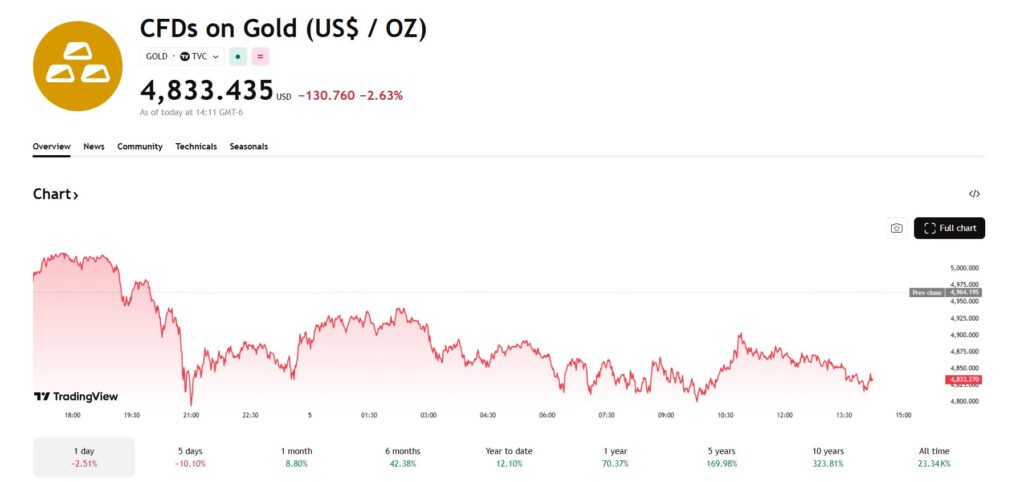 금값 4800달러대 추락… 하루 새 130달러 증발