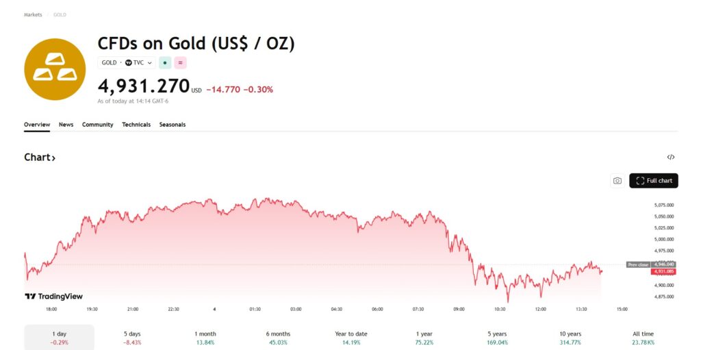 [멕시코=심영재 특파원] 4일(현지시각) 국제 금값이 장 초반 한때 온스당 5000달러를 돌파하며 상승 흐름을 이어갔지만, 장 후반 들어 상승 폭을 반납하며 4930달러 선으로 밀렸다. 전일 기록한 6% 급등에 이어 이틀 연속 상승 흐름이 이어졌으나, 미국 경제지표 혼조와 연방준비제도(Fed·연준)의 통화정책 경로에 대한 불확실성이 다시 고개를 들며 금값은 고점 대비 다소 주춤한 모습을 보였다. 전일 금 선물 가격은 […]