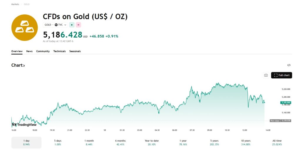 [멕시코=심영재 특파원] 국제 금 가격이 10일(현지시각) 뉴욕 시장에서 상승세를 이어가며 온스당 5100달러대 후반에서 거래됐다. 중동 군사 충돌을 둘러싼 불확실성과 함께 달러 약세, 미 국채금리 하락이 동시에 나타나면서 안전자산인 금에 대한 수요가 유지된 영향으로 풀이된다. 트레이딩뷰 기준 금 CFD 가격은 이날 온스당 5186.428달러를 기록하며 전일 대비 46.858달러(0.91%) 상승했다. 장중 가격은 한때 5230달러 부근까지 접근하며 상승 모멘텀을 […]