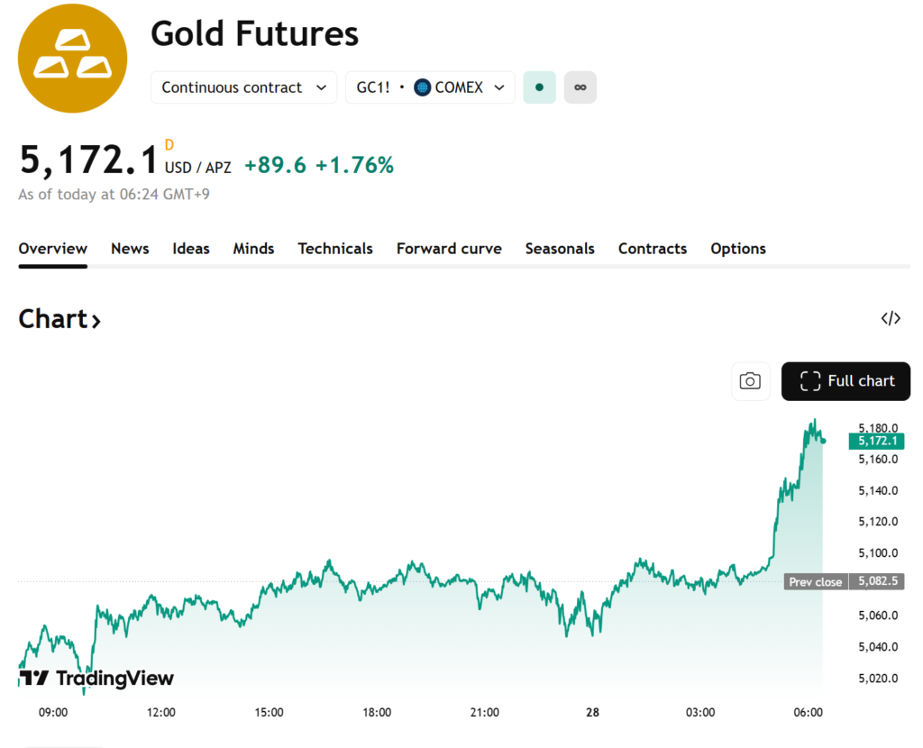 [멕시코=심영재 특파원] 27일(현지시각) 뉴욕 금 선물 가격이 장중 다시 사상 최고치를 경신하며 강세 흐름을 이어갔다. 연방공개시장위원회(FOMC) 회의를 앞두고 달러 약세가 심화되자 안전자산 선호 심리가 강화되며 금으로 자금이 유입되는 모습이다. COMEX 기준 금 선물 연속물은 장중 온스당 5172.1달러까지 상승하며 전일 대비 89.6달러(1.76%) 올랐다. 전일 종가(5082.5달러)를 기준으로 한 상승폭이다. 최근 달러지수가 급락하며 4년 만에 최저 수준으로 내려간 […]