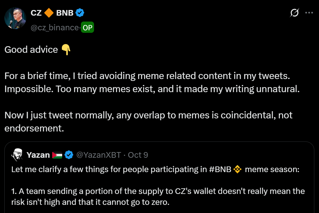 바이낸스 공동창립자 창펑자오, CZ가 자신의 트윗은 투자 추천이 아니라며 선을 긋자, BNB 기반 밈코인 시장이 하루 만에 최대 95% 폭락했다. 과열된 시장은 순식간에 냉각됐고, 팬케이크스왑 거래량도 급격히 감소했다.