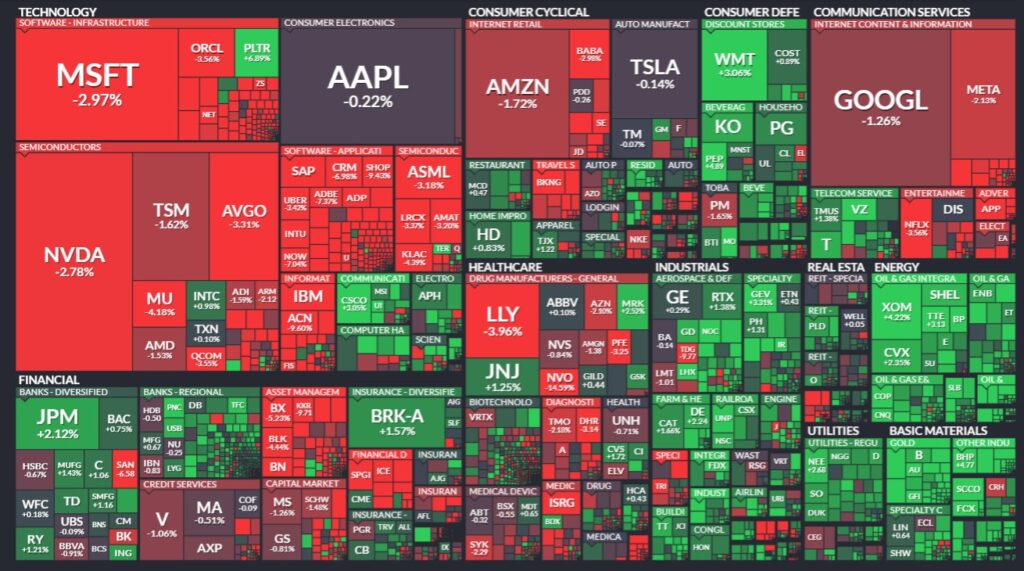 [멕시코=심영재 특파원] 뉴욕증시는 기술주 전반에 걸친 매도 압력 속에 하락 마감했다. 특히 인공지능(AI)과 소프트웨어 중심주의 급락이 두드러졌으며, 투자자들은 경기 회복과 연관된 전통 소비·금융주로 포트폴리오를 일부 회전시켰다. 3일(현지시각) 다우지수는 장중 한때 0.5% 상승하며 4만9653.13포인트로 사상 최고치를 경신했으나, 오후 들어 매도세가 확대되며 전일 대비 166.67포인트(0.34%) 하락한 4만9241.0에 마감됐다. S&P500지수는 58.63포인트(0.84%) 내린 6917.81을 기록했으며, 나스닥종합지수는 336.92포인트(1.43%) 급락하며 2만3255.2에 […]
