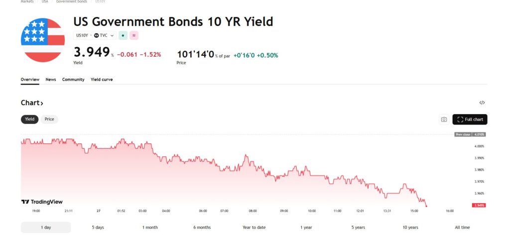 [멕시코=심영재 특파원] 뉴욕 채권시장은 27일(현지시각) 중동 지정학적 긴장과 증시 급락에 따른 안전자산 선호가 맞물리며 강세 흐름을 이어갔다. 기준물인 10년 만기 국채금리는 4% 아래로 내려서며 지난해 11월 이후 최저 수준을 기록했다. 이날 10년물 국채금리는 3.949%로 전일 대비 0.061%포인트 하락했다. 장중에는 3.97%대까지 떨어지며 4%선을 명확히 하회했다. 가격은 101’14로 0.50% 상승했다. 월간 기준으로 10년물 금리는 27bp 급락해 최근 […]