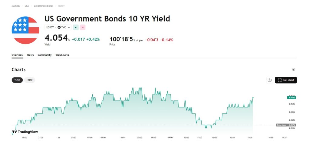 [멕시코=심영재 특파원] 뉴욕 채권시장은 25일(현지시각) 주초 급락했던 국채금리가 반등하며 10년물 수익률이 4.05%선을 넘어섰다. 트럼프 대통령의 전면 관세 발표로 촉발됐던 안전자산 선호가 완화되고 연방준비제도(Fed·연준)의 조기 금리 인하 기대가 후퇴한 영향이다. 트레이딩뷰에 따르면 미 국채 10년물 수익률은 이날 4.054%로 전장 대비 0.017%포인트 상승했다. 상승률은 0.42%다. 가격은 100과 18/32로 표시되는 100’18’5 수준에서 전일 대비 0’04’3 하락하며 금리 상승과 […]
