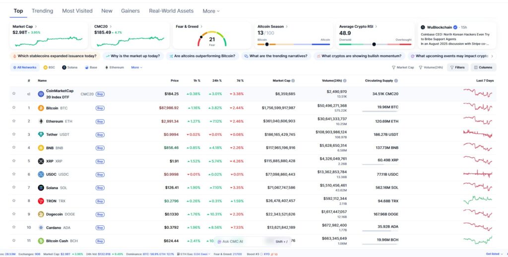 [멕시코=심영재 특파원] 19일(현지시각) 디지털자산(가상자산) 시장은 비트코인이 다시 한 번 8만9000달러 선 돌파를 시도하며 제한적 반등세를 이어가는 가운데, 이더리움은 전일 대비 7% 이상 상승하며 3000달러 회복을 눈앞에 두고 있다. 주요 알트코인도 동반 반등세를 보였으나, 아서 헤이스(Arthur Hayes)의 이더리움 대량 이체 소식이 단기적으로 시장에 혼선을 주고 있다. 코인마켓캡 기준 19일 디지털자산 시가총액은 전일 대비 3.95% 증가한 2.98조달러를 […]