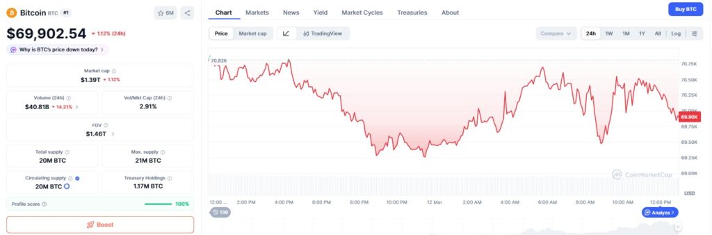 [멕시코=심영재 특파원] 12일(현지시각) 뉴욕 디지털자산(가상자산) 시장은 중동 지정학적 긴장과 에너지 가격 급등, 금융시장 불안이 겹치며 높은 변동성을 보였다. 다만 주요 위험자산이 전반적으로 하락하는 가운데서도 비트코인은 심리적 지지선인 7만달러 부근을 유지하며 상대적 방어력을 보였다. 코인마켓캡에 따르면 이날 글로벌 디지털자산 시가총액은 약 2조3800억달러로 전일 대비 약 0.85% 감소했다. 시장 대표 지수인 CMC20은 143.15를 기록하며 약 1.23% 하락했다. […]