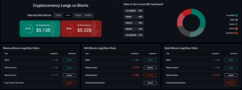 [블록미디어 양원모 기자] 디지털자산 시장이 하락세를 이어가는 가운데 파생상품 시장에서도 숏 포지션 비중이 소폭 우위를 보이며 단기 약세 심리가 이어지고 있다. 특히 주요 거래소 고래 계정에서 약세 포지션이 다수 포착되면서 시장 경계 심리가 확대되는 모습이다. 4일(현지시각) 코인글래스 데이터에 따르면 최근 4시간 기준 디지털자산 파생시장 테이커 매수·매도 거래량은 숏 포지션이 근소하게 우위를 나타냈다. 롱 거래량은 51억3000만달러(약 […]