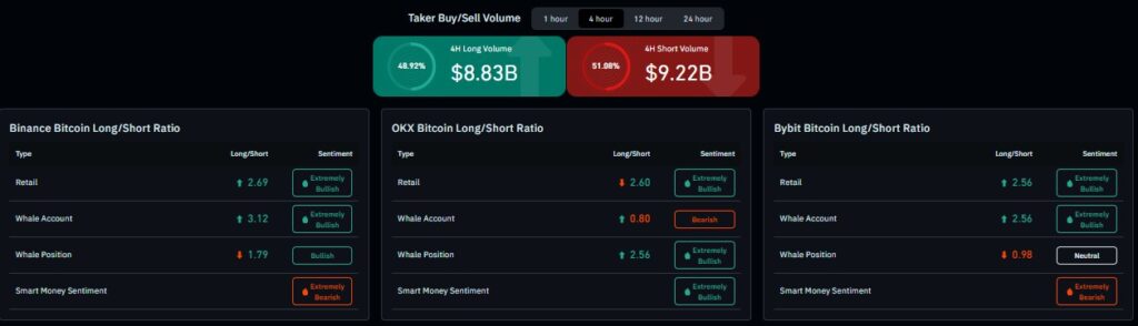 [블록미디어 양원모 기자] 파생상품 시장에서 주요 자산을 중심으로 숏 포지션 우위 흐름이 이어지고 있다. 비트코인 가격이 하락 압력을 받는 가운데 거래소별 롱·숏 비율과 테이커 매매 동향에서도 매도 우위 신호가 다수 포착되며 파생시장 전반에 경계 심리가 반영된 모습이다. 2일(현지시각) 코인글래스 따르면 4시간 기준 테이커 롱 거래량은 88억3000만달러(약 12조8723억원), 숏 거래량은 92억2000만달러(약 13조4427억원)로 집계됐다. 전체 거래 약 […]
