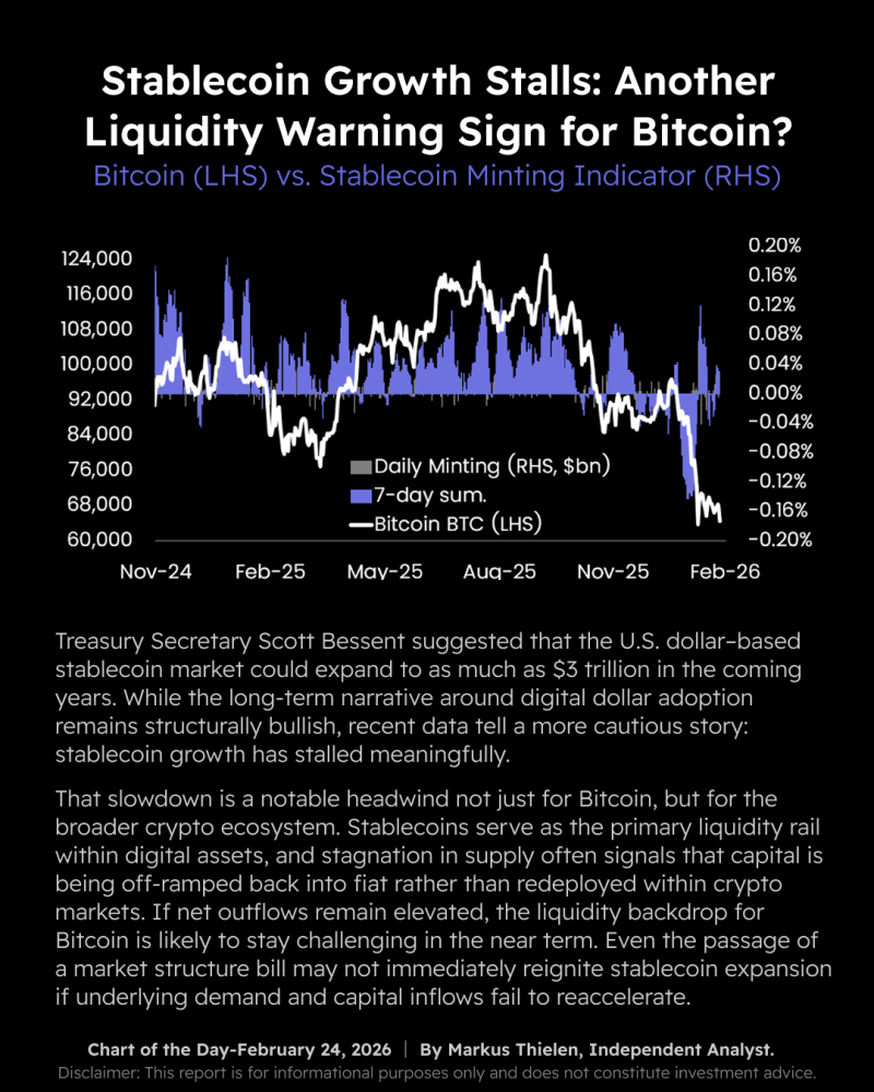 가상자산 금융 서비스 기업 매트릭스포트(Matrixport)가 스테이블코인 성장이 뚜렷하게 둔화되면서 가상자산 시장의 상승 저항이 커지고 있다고 경고했다. 매트릭스포트는 오늘 발표한 차트 분석에서 미국 재무장관 스콧 베센트(Scott Bessent)가 최근 향후 몇 년간 달러 스테이블코인의 시장 규모가 3조 달러까지 확대될 것으로 전망했지만, 최신 데이터는 단기 모멘텀이 약화되고 있음을 보여준다고 밝혔다. 매트릭스포트는 “장기적으로 디지털 달러의 침