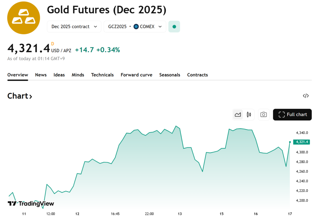 [멕시코=심영재 특파원] 금 선물 가격이 미국 고용 지표 부진과 안전자산 수요 증가에 힘입어 반등했다. 현지시각 16일 뉴욕상품거래소(COMEX)에서 거래된 2025년 12월물 금 선물은 전일 대비 14.7달러(0.34%) 오른 온스당 4321.4달러를 기록하며, 10월 이후 최고치를 경신했다. 이번 상승은 미국의 노동시장 둔화를 시사하는 지표가 연달아 발표되면서 연방준비제도(Fed)의 금리 동결 또는 인하 기대가 강화된 데 따른 것으로 해석된다. 지연 발표된 […]