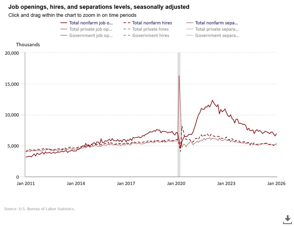 [멕시코=심영재 특파원] 미국 구인 규모가 690만건 수준에서 정체됐다. 채용은 감소하며 노동시장 둔화 신호가 뚜렷해지고 있다. 31일(현지시각) 미국 노동통계국(BLS)에 따르면 올해 2월 구인 건수는 690만건으로 전월 대비 큰 변화가 없었다. 구인율 역시 4.2%로 유지됐다. 숙박·음식 서비스업에서 21만1000건 감소했고, 광업·벌목업에서도 감소가 나타났다. 일부 업종 중심으로 수요 둔화가 진행되고 있는 모습이다. 지난달 채용 건수는 480만건으로 전월보다 49만8000건 줄었다. […]