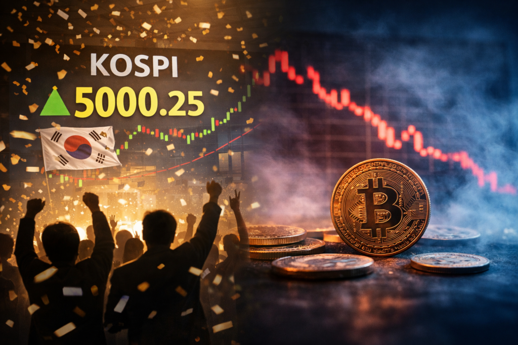 [블록미디어 오수환 기자] 코스피가 사상 처음으로 5000선을 돌파하며 강한 상승 랠리를 이어가고 있다. 정책 기대와 반도체를 중심으로 한 실적 개선이 맞물리며 시중 유동성이 증시로 대거 유입된 결과다. 반면 디지털자산(가상자산) 시장은 글로벌 규제 불확실성과 투자 매력 약화 속에 거래가 급감하며, 양 시장 간 자금 흐름의 대비가 뚜렷해지고 있다. 24일 한국거래소에 따르면 코스피 지수는 지난해 12월1일 3920.37포인트에서 […]