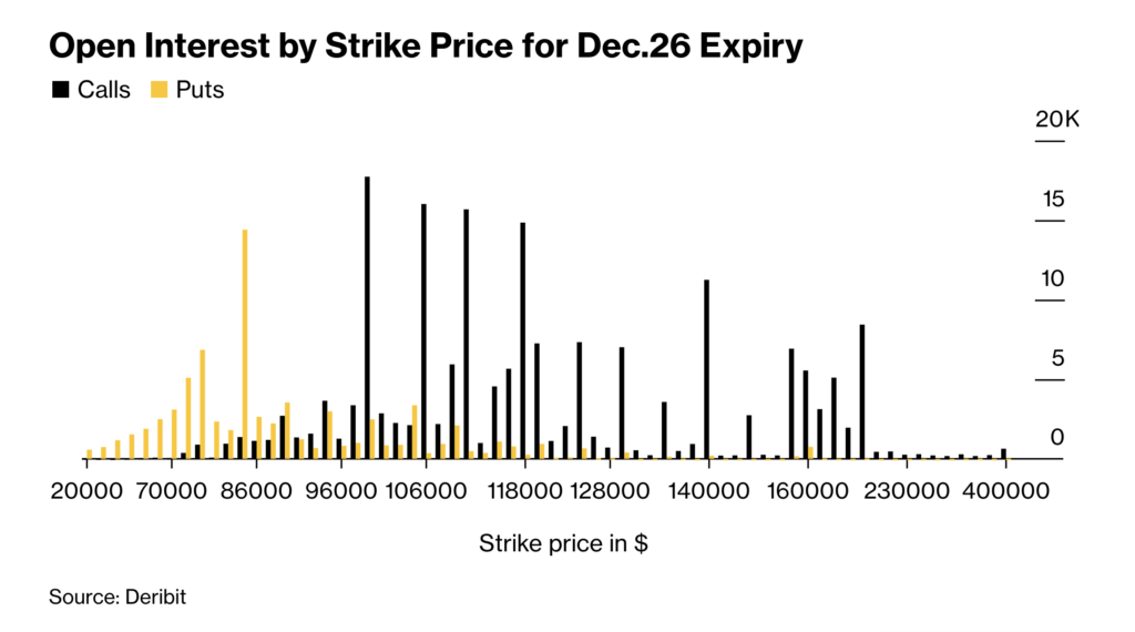 [블록미디어 박수용 기자] 연말을 앞두고 비트코인(Bitcoin·BTC) 옵션시장이 대규모 만기 이벤트로 긴장하고 있다. 시장에서는 이미 높아진 변동성이 만기 전후로 더 확대될 수 있다는 관측이 나온다. 18일(현지시각) 블룸버그에 따르면 12월26일 만기되는 약 230억달러(약 34조원) 규모의 비트코인 옵션 계약이 시장 변동성을 키울 수 있다는 분석이 제기됐다. 해당 물량은 글로벌 최대 비트코인 옵션 거래소 데리비트(Deribit)에 쌓인 전체 미결제약정의 절반 […]