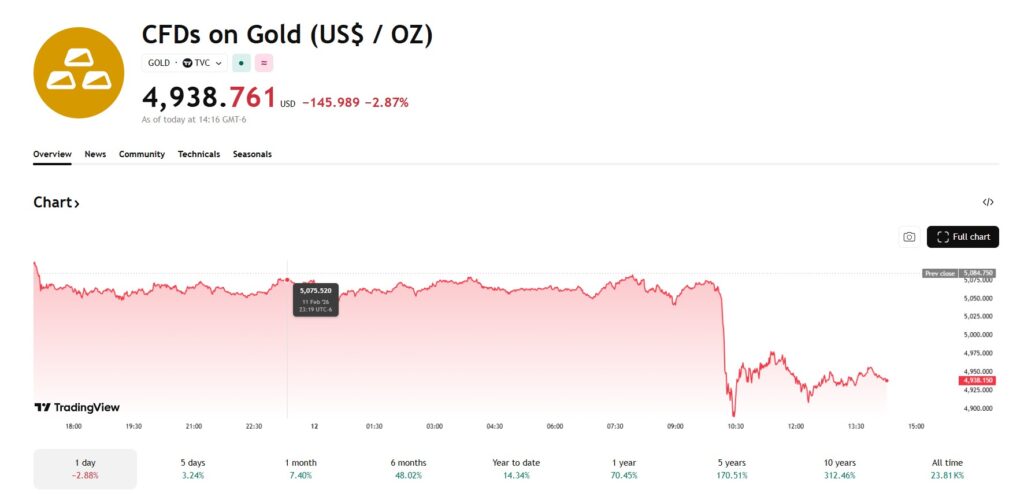 [멕시코=심영재 특파원] 12일(현지시각) 금 가격이 급락하며 온스당 5000달러 아래로 밀려났다. 뉴욕상품거래소(COMEX)에서 2월물 금 선물은 전일 대비 147.90달러(2.92%) 하락한 4923.70달러에 거래됐다. 이는 5일 이후 최저 수준이며, 지난달 30일 이후 가장 큰 일일 낙폭을 기록했다. 트레이딩뷰 기준 현물 CFD 가격도 4938.76달러로 하루 새 145.98달러(2.87%) 떨어졌다. 장중 한때 5075달러를 상회했던 금 가격은 오전 10시경 급락세로 전환되며 대규모 하방 […]