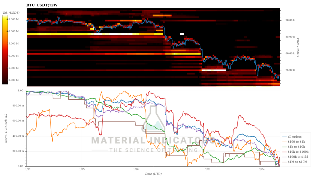 [블록미디어 명정선 기자]비트코인이 연속적인 저점 하락 흐름을 이어가는 가운데 선물 시장 하단에서 대규모 매수 대기 물량이 포착되며 시장 해석이 엇갈리고 있다. 구조적인 하락 추세가 이어지는 상황에서 하방에 쌓인 유동성이 실질적인 지지 역할을 할지 아니면 추가 하락을 유도하기 위한 전략적 배치인지를 두고 논쟁이 커지고 있다. 5일 코인글래스에 따르면 바이낸스 비트코인 무기한 선물(BTC 퍼페추얼) 오더북에서 6만달러에서 6만3000달러 […]