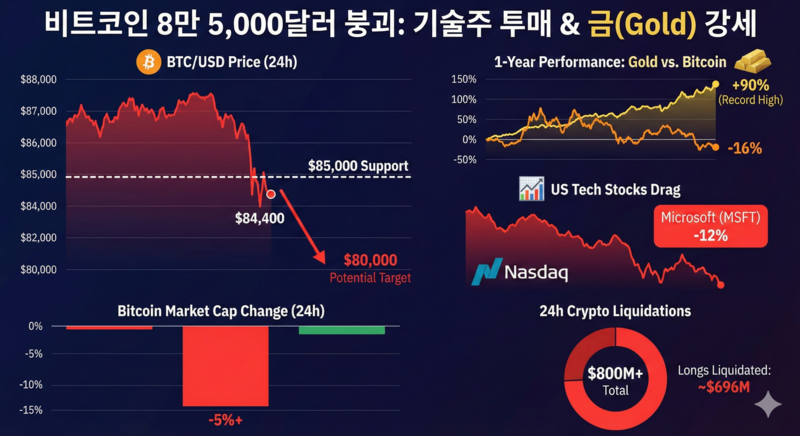 비트코인(BTC)이 미국 증시의 기술주 급락 충격에 동조하며 8만 5,000달러 선을 내어주고 5% 넘게 폭락했다. 안전자산인 금은 사상 최고가를 경신하며 비트코인과 정반대의 행보를 보이는 가운데, 주요 지지선 붕괴 시 8만 달러까지 추가 하락할 수 있다는 경고가 나왔다.