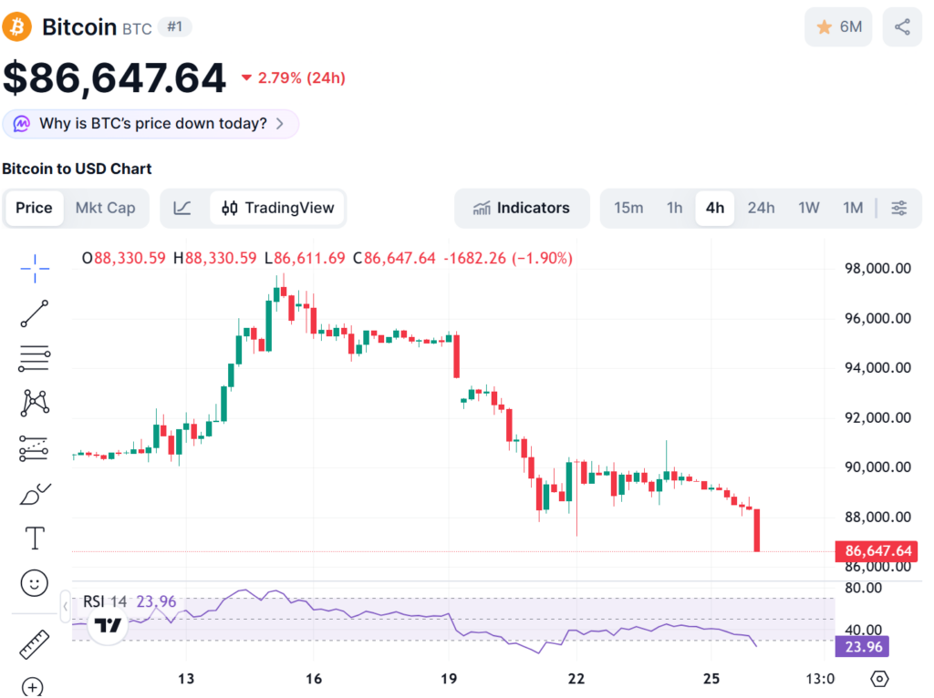 [블록미디어 명정선 기자] 비트코인이 8만7000달러가 붕괴됐다. 코인마켓캡에서 26일(한국시각) 오전 4시 25분 현재 비트코인은 8만6000달러대에서 거래되고 있다.