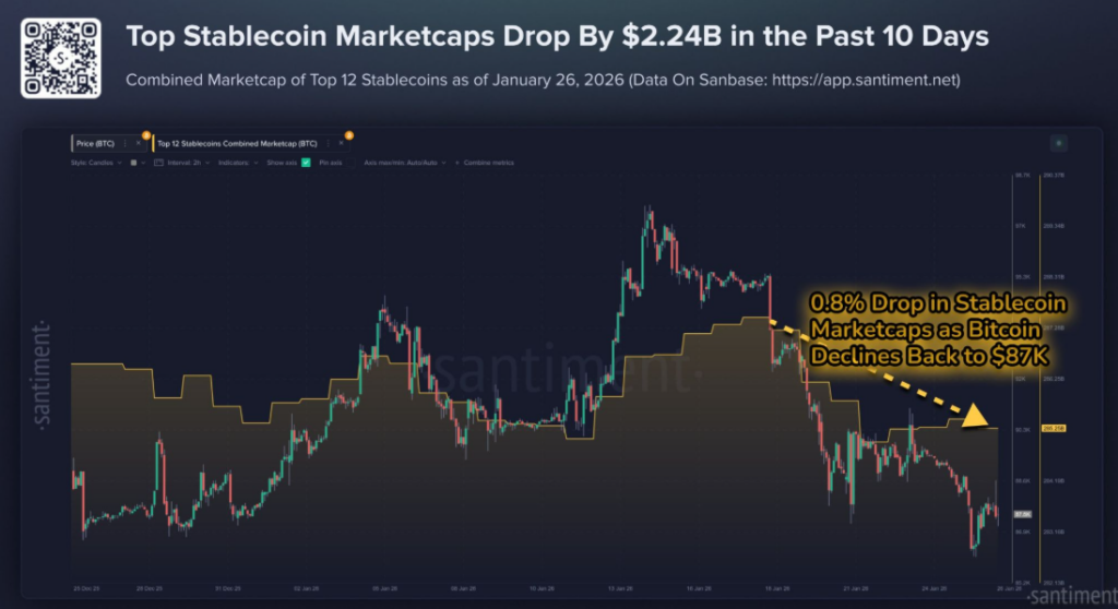[블록미디어 명정선 기자] 비트코인과 스테이블코인 시장에서 빠져나간 자금이 금과 은으로 이동하고 있다는 분석이 나왔다. 최근 10일간 스테이블코인 시가총액이 22억4000만달러 감소한 가운데 비트코인은 고점 대비 30% 가까이 하락한 반면 금과 은은 사상 최고치를 경신하며 전통적 안전자산 선호 흐름이 뚜렷해지고 있다는 평가다. 27일 온체인 데이터 분석업체 샌티멘트는 최근 스테이블코인 시가총액 감소가 단기적인 암호화폐 시장 회복을 지연시키는 요인으로 […]