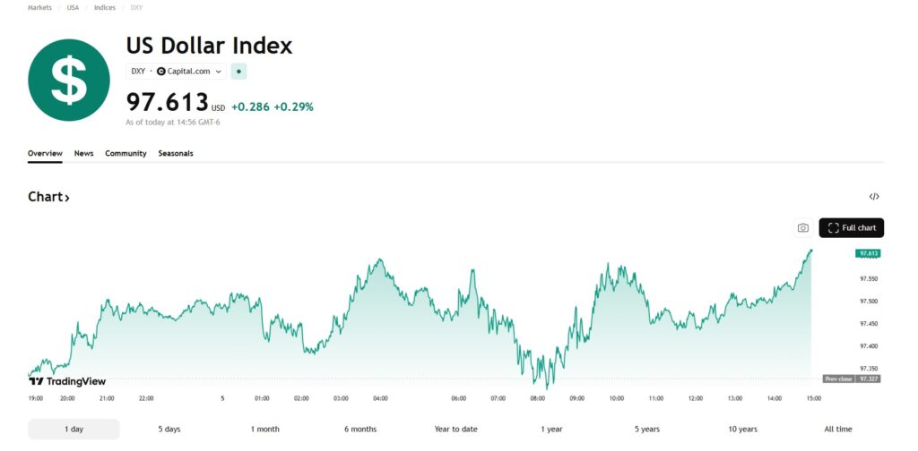 [멕시코=심영재 특파원] 5일(현지시각) 미국 달러지수(DXY)가 상승세를 나타내며 1주 만의 고점을 기록했다. 이날 달러지수는 전장보다 0.29% 오른 97.613에 거래됐으며, 장중에는 리스크 자산 매도세에 따른 유동성 수요 확대가 상승 요인으로 작용했다. 주요 통화 대비 달러는 유로, 엔화에 대해 모두 강세를 보였다. 달러지수 역시 소폭 상승하며 시장 전반의 ‘달러 선호 현상’이 되살아나고 있음을 보여줬다. 미국 증시와 디지털자산(가상자산) 시장의 […]