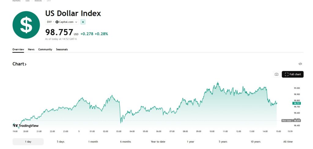 [멕시코=심영재 특파원] 5일(현지시각) 뉴욕 외환시장에서 미국 달러화가 강세를 보였다. 중동 지역 군사 충돌이 장기화되며 글로벌 금융시장의 불확실성이 커지자 안전자산 선호가 확대되면서 달러 수요가 다시 증가했다. 이날 달러 인덱스(DXY)는 98.757을 기록하며 전일 대비 0.278포인트 상승해 0.28% 올랐다. 장중 흐름을 보면 달러 지수는 한때 98.4 수준까지 내려갔다가 이후 상승세로 돌아서며 99선에 근접하기도 했고 이후 98.7대에서 등락을 이어갔다. […]
