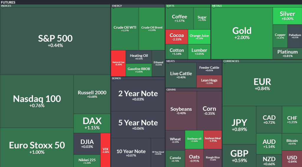 [이 시각 글로벌 선물] 美 선물 강세…은 8% 급등, 국채 금리 상승 속 달러 약세