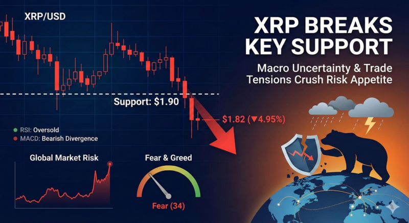 엑스알피(XRP, 리플)가 거시경제의 불확실성과 무역 긴장 고조라는 이중고에 시달리며 1.82달러 선까지 주저앉았다. 위험 회피 심리가 시장을 지배하면서 견고했던 박스권 지지선이 무너졌고, 이는 단순한 가격 조정을 넘어 추세적인 하락 국면으로의 진입을 예고하고 있다.