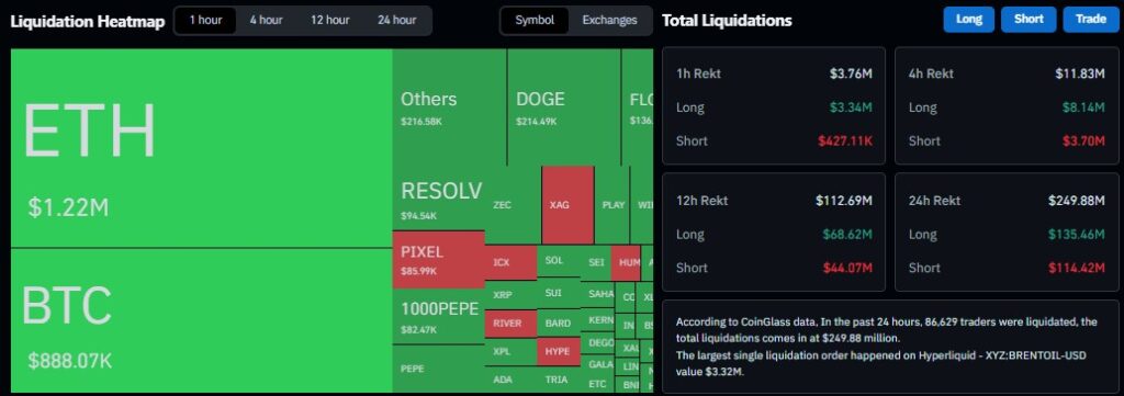 [블록미디어 양원모 기자] 디지털자산 시장이 소폭 조정을 이어가는 가운데 파생상품 시장에서도 롱 포지션 중심의 청산이 발생, 단기 투자심리가 다소 위축된 모습이다. 11일(현지시각) 코인글래스(Coinglass)에 따르면 최근 24시간 동안 디지털자산 파생상품 시장에서 총 2억4988만달러(약 3673억원) 규모의 포지션이 청산됐다. 롱 포지션 청산은 1억3546만달러(약 1991억원), 숏 포지션 청산은 1억1442만달러(약 1681억원)로 집계됐다. 같은 기간 약 8만6629명의 트레이더가 강제 청산된 것으로 […]