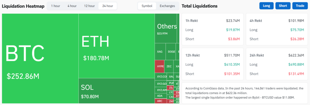 [블록미디어 함지현 기자] 비트코인 가격이 단기간에 7만6000달러에서 7만1000달러 대까지 급락하면서 디지털자산(가상자산) 파생상품 시장에서 롱(매수) 포지션 중심으로 1억원에 가까운 포지션들이 청산됐다. 단기(1시간) 베팅에서도 같은 흐름이 이어지며 비트코인(BTC), 이더리움(ETH) 등 주요 종목에서 반등 기대감을 보인 투자자들이 집중 포화를 맞았다. 5일 코인글래스 집계에 따르면, 최근 24시간 동안 전체 청산 규모는 6억2254만달러(약 9093억원)로 집계됐다. 이 가운데 롱 포지션 청산 […]