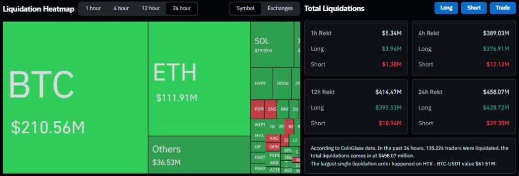 [블록미디어 양원모 기자] 비트코인이 6만4000달러대까지 밀리는 등 주요 디지털자산이 하락세를 보이는 가운데 파생상품 시장에서 대규모 포지션 정리가 발생했다. 단기 반등 기대가 누적된 상황에서 가격이 하방으로 기울며 레버리지 롱 물량이 집중 청산되는 모습이다. 23일(현지시각) 코인글래스에 따르면 최근 24시간 동안 글로벌 디지털자산 시장에서 발생한 청산 규모는 총 4억5807만달러(약 6619억8130만원)로 집계됐다. 롱 포지션 청산이 4억2872만달러(약 6196억200만원)로 대부분을 차지했고, […]