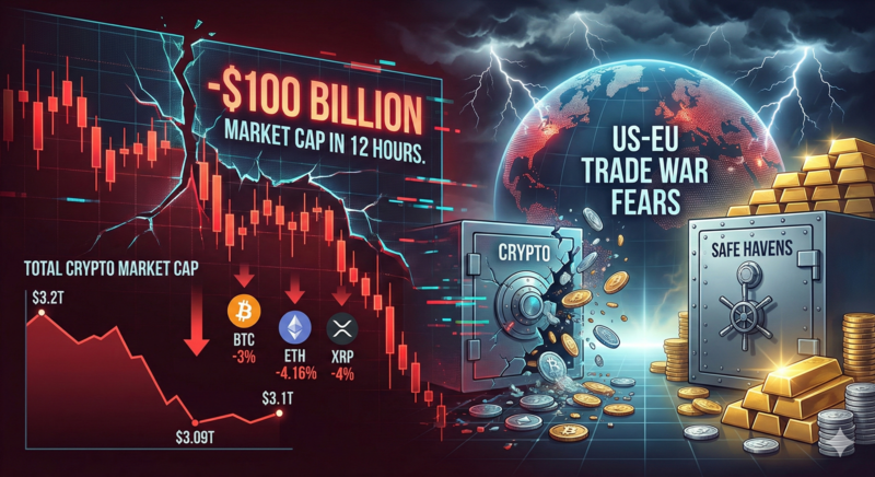 2026년 순조로운 출발을 보이던 암호화폐 시장이 불과 12시간 만에 시가총액 1,000억 달러를 증발시키며 패닉에 빠졌다. 미국과 유럽연합(EU) 간의 무역 전쟁 우려가 재점화되면서 위험 자산 회피 심리가 급격히 확산된 결과로 풀이된다.