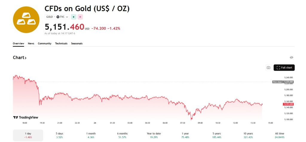 [멕시코=심영재 특파원] 뉴욕 금시장은 24일(현지시각) 안전자산 선호 심리에도 불구하고 미 국채로 자금이 이동하면서 약세를 이어갔다. 트레이딩뷰에 따르면 금 CFD 가격은 온스당 5151.46달러로 전일 대비 1.42% 하락했다. 장중에는 5130달러선까지 밀리며 낙폭을 확대했다. 이날 금은 한때 전일 대비 2% 가까이 떨어지며 최근 상승 흐름에 제동이 걸렸다. 전월물 금 선물은 5155.80달러로 0.9% 하락했다. 최근 1년 수익률은 75.48%, 연초 […]