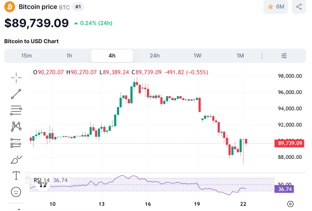 [멕시코=심영재 특파원] 21일(현지시각) 뉴욕 디지털자산 시장에서 비트코인(BTC)은 하루 동안 급등락을 반복하며 극심한 변동성을 나타냈다. 장 초반 8만8000달러 선이 붕괴된 이후 8만7500달러 안팎까지 밀렸으나, 트럼프 대통령의 다보스 세계경제포럼(WEF) 발언을 계기로 9만달러를 재차 회복했다. 다만 반등은 오래 이어지지 못했고 이후 다시 매물이 출회되며 8만9700달러선으로 후퇴하는 롤러코스터 장세가 전개됐다. 코인마켓캡 기준 비트코인은 24시간 기준 0.24% 상승한 8만9739달러에 거래되고 […]