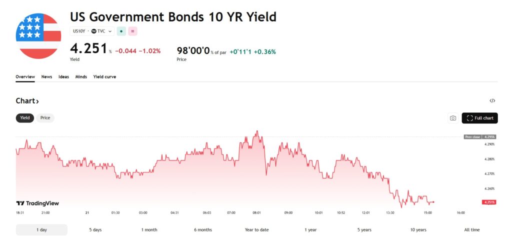 [멕시코=심영재 특파원] 21일(현지시각) 뉴욕 채권시장에서 미국 국채 수익률은 전 구간에서 하락 마감했다. 전일 트럼프 대통령의 관세 위협으로 촉발된 매도세가 하루 만에 진정된 가운데, 지정학적 불확실성 해소 조짐과 20년물 입찰 호조, 일본 국채 반등 등이 복합적으로 작용하며 국채 수요가 다시 살아났다. 이날 미국 10년물 국채 수익률은 전일 대비 4.4bp 하락한 4.251%로 기록됐다. 전일 고점이었던 4.30%대에서 물러나며 […]