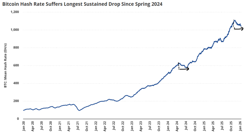 비트코인 네트워크의 해시레이트(연산력)가 2024년 봄 이후 가장 긴 하락세를 기록하며 채굴 업계에 비상이 걸렸다. 업계에서는 인공지능(AI) 데이터센터의 전력 수요 급증이 주요 원인으로 지목되고 있다. [!–{MTITLE}–!]채굴 지표 일제히 하락[!–{//MTITLE}–!] 글로벌 자산운용사 반에크(VanEck)는 금일 발표한 보고서에서 “최근 비트코인 해시레이트가 2024년 봄 이후 가장 긴 지속적 하락세를 보이고 있다”고 밝혔다. 보고서에 따르면 비트