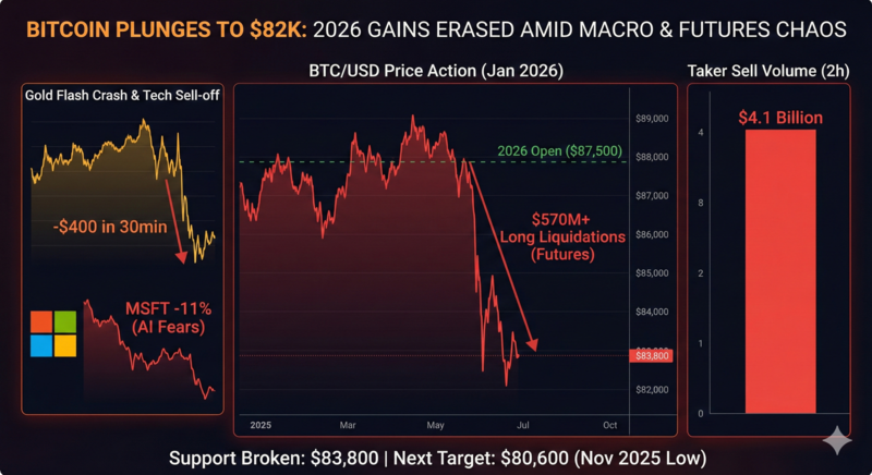 ▲ 비트코인 8만 2,000달러로 추락… MS 매도세와 금 플래시 크래시로 2026년 상승분 증발/제미나이 생성 이미지 비트코인(BTC)이 선물 시장의 과도한 레버리지 청산과 거시경제의 악재가 겹치며 8만 2,000달러 선까지 추락했다. 2026년 들어 쌓아 올린 모든 상승분이 하루아침에 증발하며 시장에 충격을 주고 있는 가운데, 11월 저점 붕괴 여부가 향후 추세의 분수령이 될 전망이다. 1월 30일(현지시간) 투자 전문매체 […]