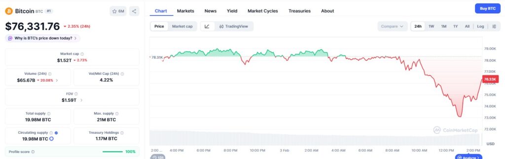 [뉴욕 코인시황/마감] “본격 크립토 윈터 왔다”… 비트코인 7.6만달러·솔라나 100달러 ‘사투’