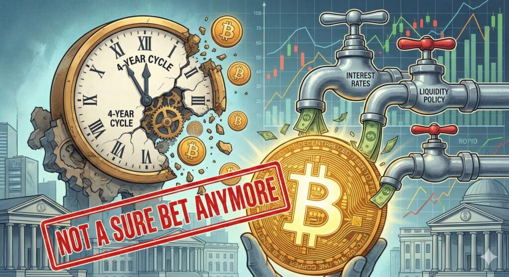 [블록미디어 양원모 기자] 비트코인 시장에서 오랫동안 통용돼 온 ‘4년 주기설’이 더 이상 유효하지 않다는 분석이 나왔다. 반감기 이후 상승을 이끌던 구조가 현물 ETF를 매개로 한 차익거래 확산으로 근본적으로 바뀌고 있다는 진단이다. 디지털자산 분석가 샤나카 안슬럼 페레라는 3일(현지시각) 엑스(옛 트위터)에 올린 글에서 “비트코인의 4년 주기는 더 이상 작동하지 않는다”고 밝혔다. 비트코인 현물 ETF를 중심으로 형성된 차익거래 […]