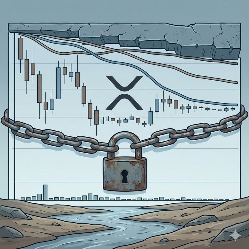 현재 XRP는 추세를 정의하는 모든 핵심 이동평균선 아래에 갇혀 있는 형국이다. 가격이 20일에서 26일 지수이동평균(EMA) 군집 부근에서 횡보하며 지지선을 구축하려 하지만 100일과 200일 EMA가 강력한 저항선으로 작용해 상승을 가로막고 있다. 매체는 이러한 현상이 매수세 유입에 따른 강세가 아니라 하방 압박에 의한 미결정 상태라고 분석했다.
